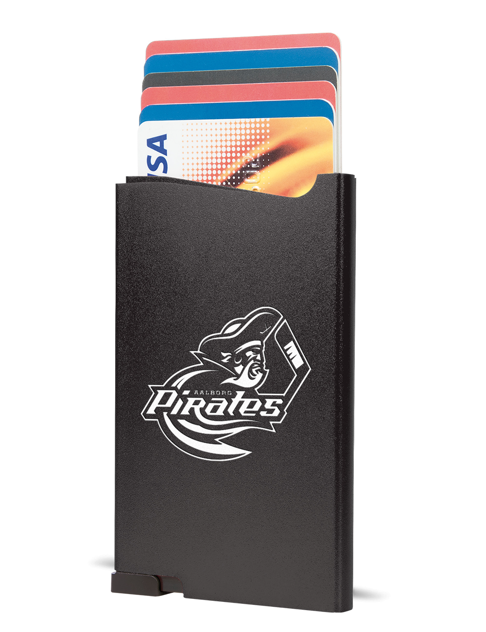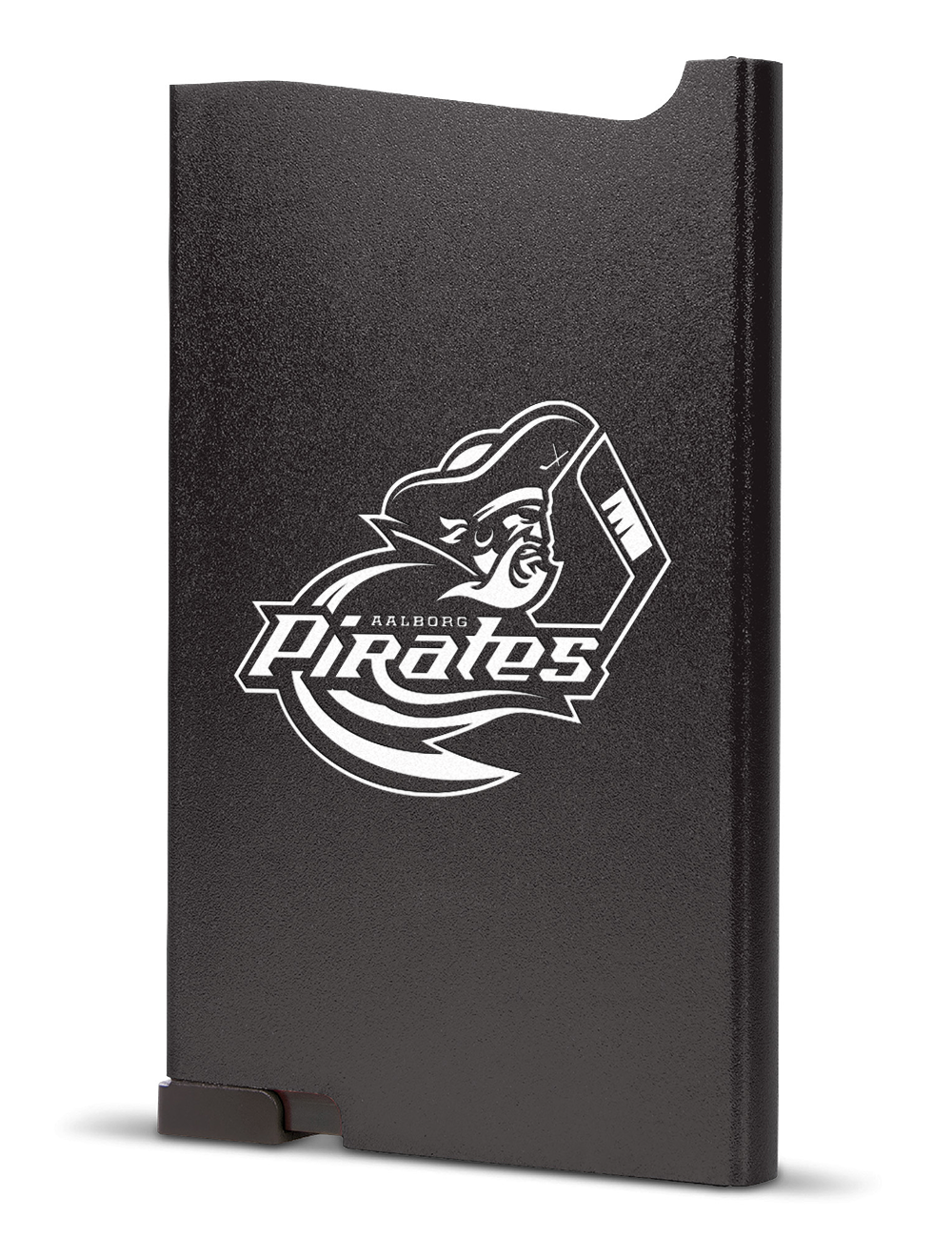 Praktisk kortholder med Pirates logoet på fronten og mulighed for eget navn graveret under logoet.
